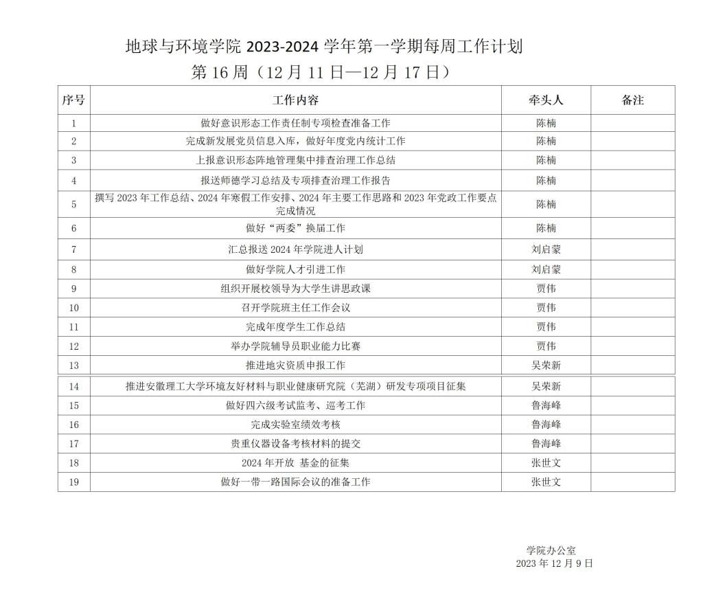 电子轮盘 2023-2024学年第一学期第16周(12月11日—12月17日)工作安排
