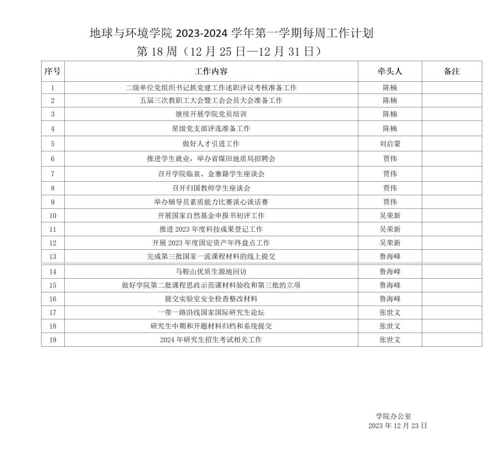 电子轮盘 2023-2024学年第一学期第18周(12月25日—12月31日)工作安排