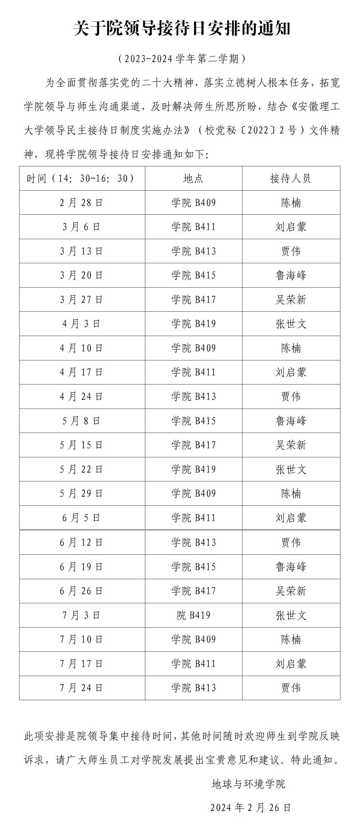 关于院领导接待日安排的通知(2023-2024学年第二学期)