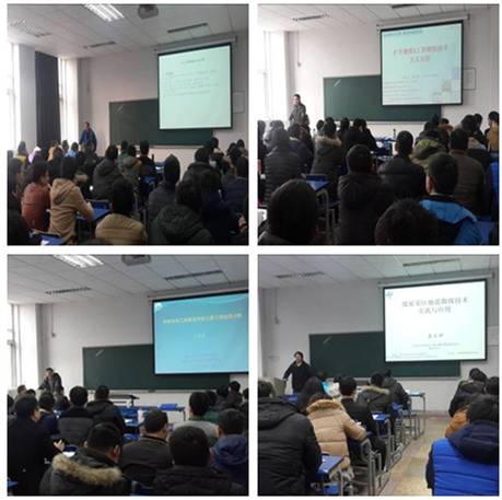 江苏安捷岩土勘察有限公司刘健总经理做了“岩土工程勘察施工技术手段、规范及应用”、浙江省水利河口研究院江晓益高级工程师做了“水利水电工程建设中的主要工程地质问题”、中国煤炭地质总局地球物理勘探研究院孟凡彬高级工程师作了“煤炭采区地震勘探技术实践与应用”、安徽惠洲地质安全研究院周官群教授级高工做了“矿井物探&工程物探技术及其应用”的专题讲座。四位专家从母校毕业从事专业技术与管理工作达10年以上,具有丰富的实践经验,取得的成绩突出。讲座期间,他们结合各自的专业领域,以实战所需要的理论方法,与自己主持完成的工程项目内容相结合,进行了生动的讲解,并对同学们毕业后的工作成长提出了宝贵意见。校友们授课中语言轻松幽默、思路清晰严谨,他们的风采给在座师生留下了深刻的印象,所教授的工程理论与实践内容受到了普遍的欢迎。
