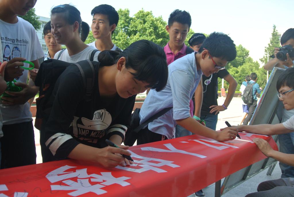 6月5日,大气污染防治宣传活动在北校区喷泉广场如火如荼开展。环保志愿者通过组织签名、有奖问答、播放音像资料、专题展板等多种方式向同学们普及大气污染防治知识。活动中,过往的同学郑重地在展板上写下自己的环保宣言,共同呼吁更多的人加入到环境保护的行列。志愿者们还向同学们赠发了“请随手拔掉充电器”的绿色书签和绿色手环,提醒同学们环保人人可为。