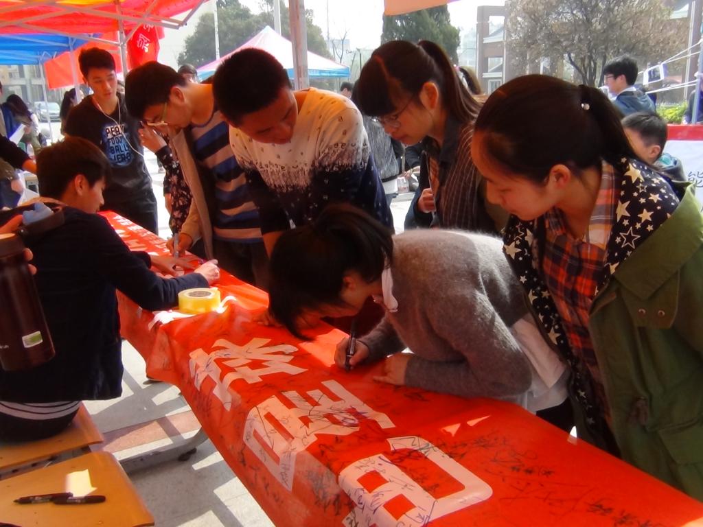 上午,志愿者们在北区喷泉广场发起“地球一小时”倡议活动,通过签名、发放环保宣传资料等方式呼吁同学们一起行动起来,为了公众共同期待的蓝色天空,从衣食住行乐的日常生活小事入手,践行可持续的生活和消费方式。同学们纷纷在“为了蓝色星球,转变生活方式”条幅上签下姓名,现场共招募了400余名志愿者参与当晚的熄灯活动。