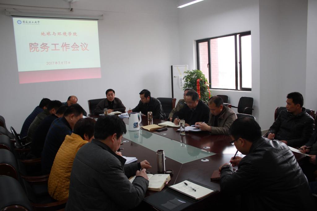 3月16日下午,电子轮盘 在406会议室召开新学期第一次院务工作会议。院长胡友彪主持会议,电子轮盘 领导班子成员、各系主任、副主任、教工党支部书记、科级干部参加了会议。