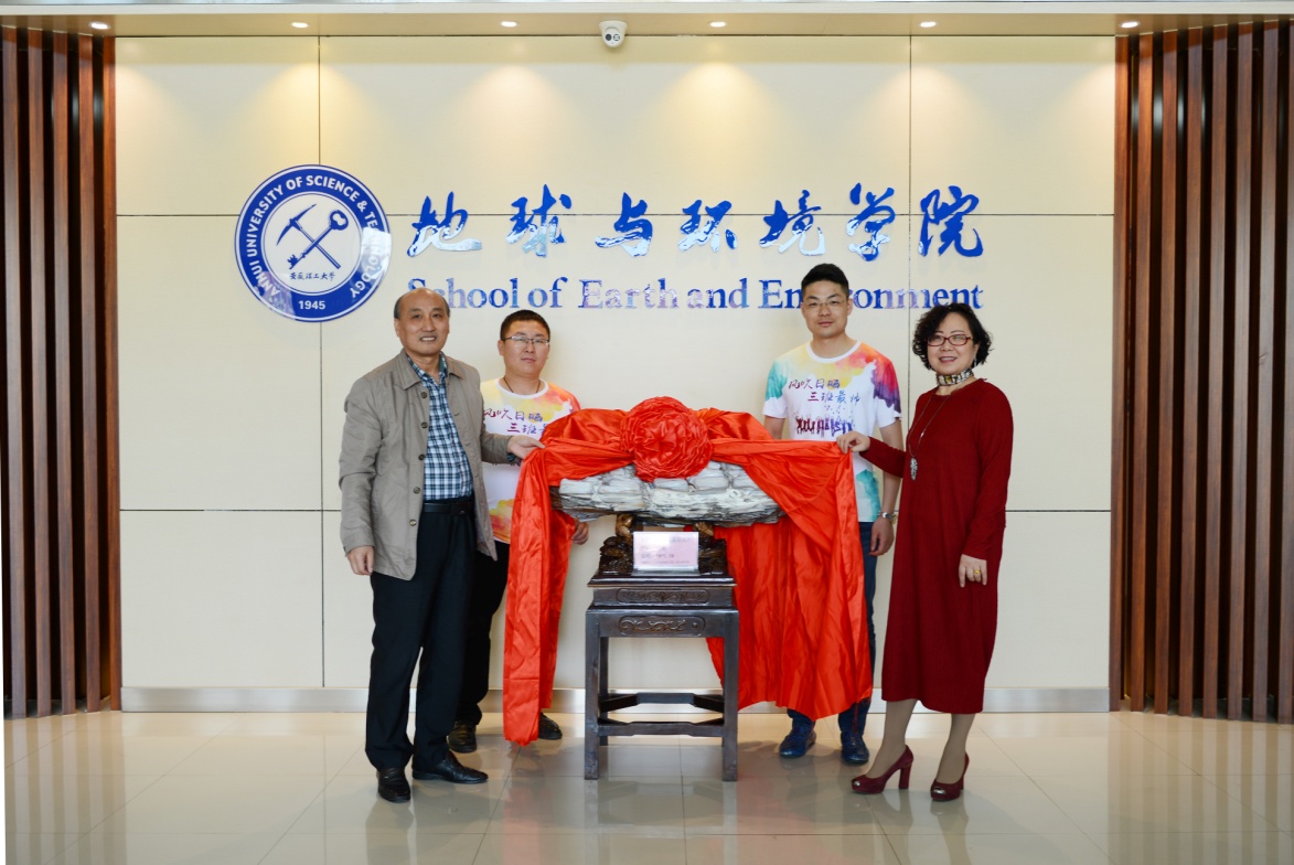 座谈会结束后,校友们向电子轮盘 捐赠了硅化木并合影留念。