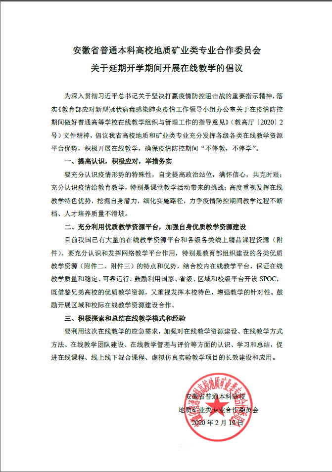 的安徽省普通本科高校地质矿业类专业合作委员会通过专委会向所有成员单位发布了关于延期开学期间积极开展在线教学活动的倡议书。
