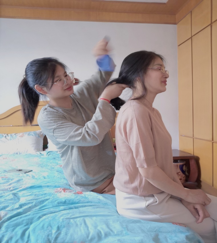 地质工程19级研究生管笛在母亲节当天为母亲梳头发,感受小时母亲为自己梳发的心情。小时您照顾保护我,长大我为您遮风挡雨。