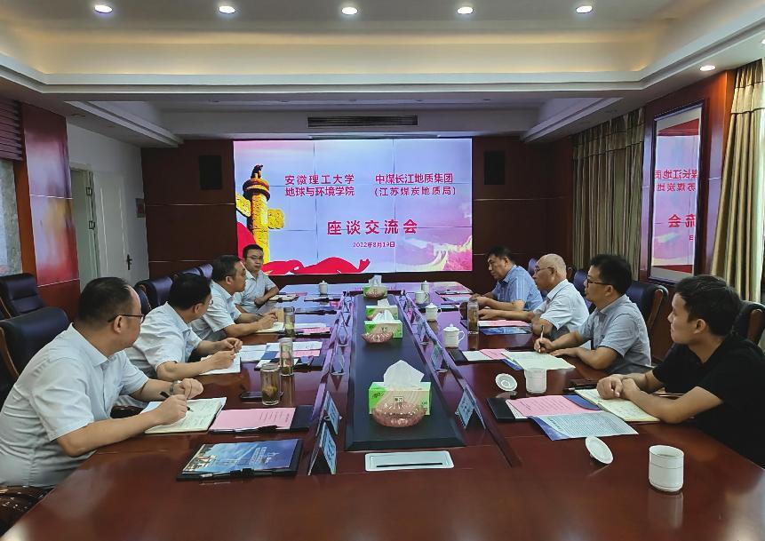 8月19日,校党委常委,副校长郑明东一行前往江苏煤炭地质局(中煤长江地质集团)调研,电子轮盘 院长刘启蒙,副院长鲁海峰等陪同参加座谈。