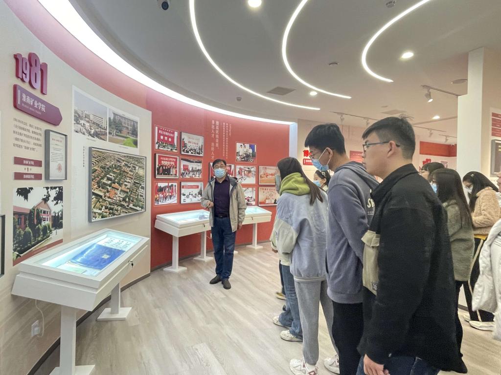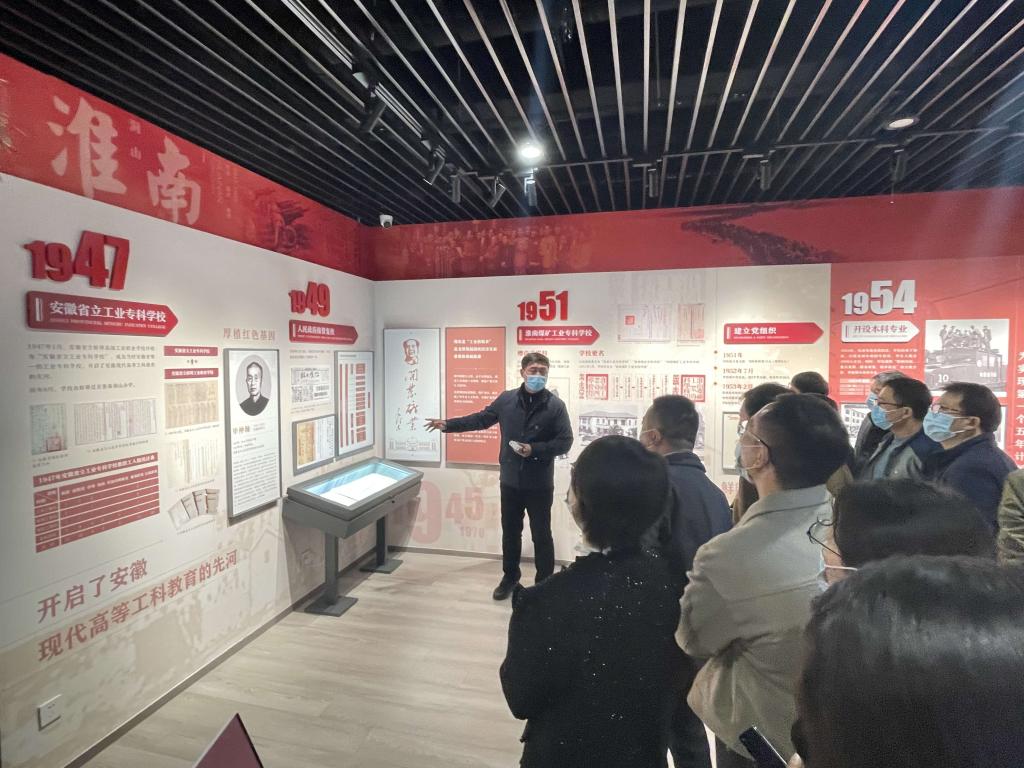 党员师生参观了校史馆两大展厅六个版块,回顾了从1945年安徽省立蚌埠高级工业职业学校、1947年安徽省立工业专科学校、1958年合肥工业大学、1971年淮南煤炭电子轮盘 到今日安徽理工大学这77年来学校的光辉历程与成就。