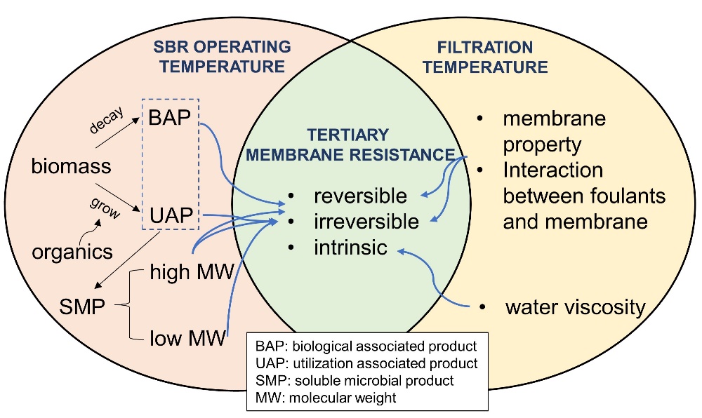 本工作构建了实验室规模序批式生物反应器(SBR)和超滤系统模拟实际污水处理厂中“二级+三级”的水处理过程,探究SBR运行温度和超滤运行温度分别以及交互对膜污染产生的影响。研究证明,当SBR运行温度为20℃,14℃和8℃且超滤运行温度为20℃时,总膜阻力在实验周期内分别增加27%,45%和82%。总膜阻力的增加来自于水力可逆膜阻力和水力不可逆膜阻力。此外,当降低超滤运行温度与对应的SBR运行温度一致时,对于在14℃和8℃运行的SBR出水,其造成的总膜阻力又进一步增加了55%和122%,这一部分膜阻力的增加分别来自于膜固有阻力在低温条件下的增加,以及由于低温条件下可溶性微生物代谢产物的增加而带来的水力可逆膜阻力和水力不可逆膜阻力的增加。统计学分析表明在三级处理中,膜污染主要由高分子量和低分子量有机物导致,其中与生物质衰减相关的有机质(BAP)是最主要膜污染物。该工作深入探讨了运行温度对生物和过滤过程的影响,为不同温度运行条件下设计膜污染缓解措施提供了理论基础。