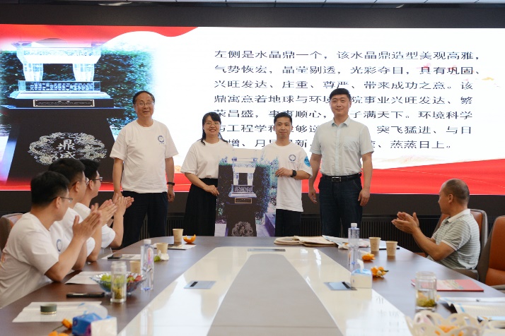 捐赠仪式上,ET实验室研究生校友向电子轮盘 捐赠水晶鼎,表达对电子轮盘 发展的美好期盼和祝福。