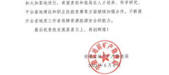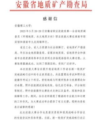 安徽省地质矿产勘查局感谢我校对省地质调查员职业技能大赛的支持