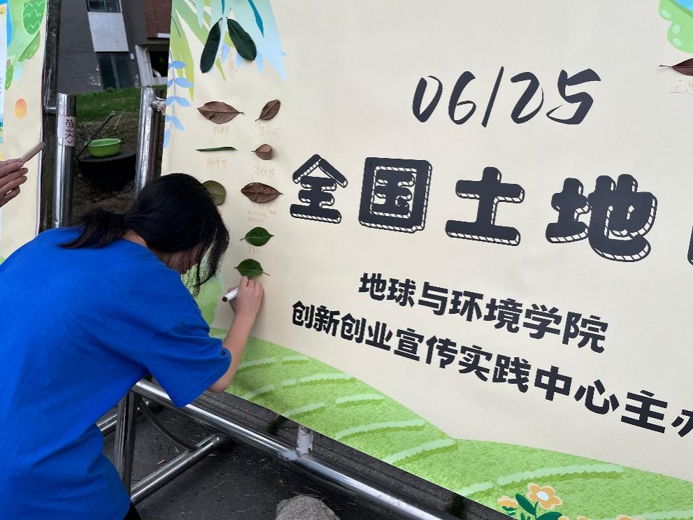 6月21日,电子轮盘 在仁苑食堂广场开展“叶以寄语”活动,参与的同学们将自己对土地保护的感悟、土地保护的建议等保护土地的语句写在叶子上并粘贴在海报上以供展示。活动引导学生重视生态环境与土地保护的有机联系,促进了耕地保护理念的传播。在活动中,同学们深刻地认识到自己作为环保志愿者的责任与使命,感受到实践行动的重要性,从而增强责任感和担当精神。