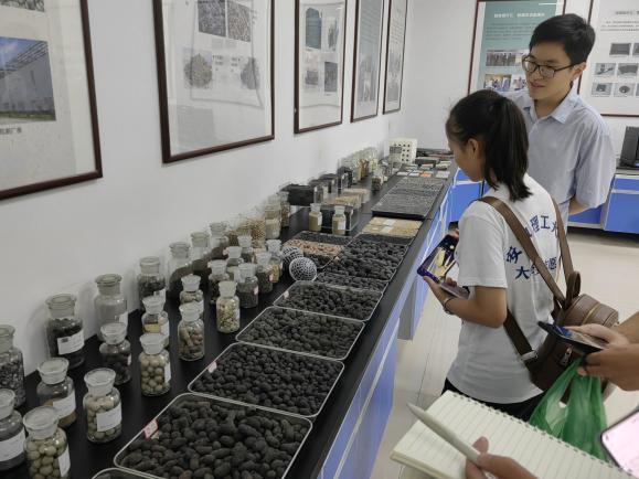 实践团首先前往位于潘集区的国家级大宗煤电固废物综合利用产业集聚基地。在基地,团队成员实地参观了煤系轻质高强轻细集料系列产品的生产过程。该系列产品是由东辰集团煤矸石研究所研发的,一种以煤矸石为原料,经破碎、预热、烧胀、冷却、分级、包装而生产的煤矸石陶粒。通过与工作人员的深入交流,团队成员了解到煤矸石陶粒具有轻质、保温、抗渗、隔音、耐酸碱腐蚀等性能,是一种优质绿色建筑轻骨料,能够完全替代建筑混凝土中的石子和卵石,可以广泛应用于桥面铺装、装配式建筑、3D打印、海洋浮岛工程、国防军事等诸多领域。