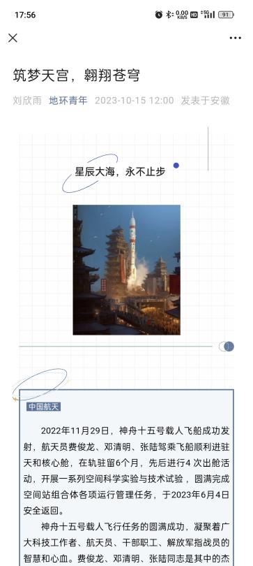 电子轮盘 各团支部开展主题团日学习“二级航天功勋奖章”获得者费俊龙、“三级航天功勋奖章”获得者邓清明、张陆的先进事迹,2022年11月29日,神舟十五号载人飞船成功发射,开展一系列空间科学实验与技术试验,圆满完成空间站组合体各项运行管理任务,于2023年6月4日安全返回。此次任务凝聚着广大科技工作者、航天员、干部职工、解放军指战员的智慧和心血。费俊龙、邓清明、张陆同志是其中的杰出代表,同学们纷纷表示将以航天英雄为楷模,学习他们矢志报国、忠诚使命、坚韧执着、精诚团结的精神。