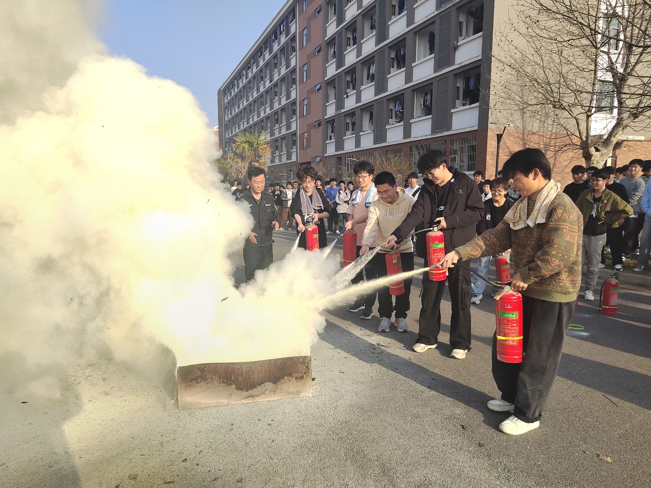 防火逃生应急演练结束后,消防科彭广峰老师现场为全体师生开展了干粉灭火器材的使用培训,部分学生代表分别进行了实际操作演练,掌握了消防器材的使用要领。