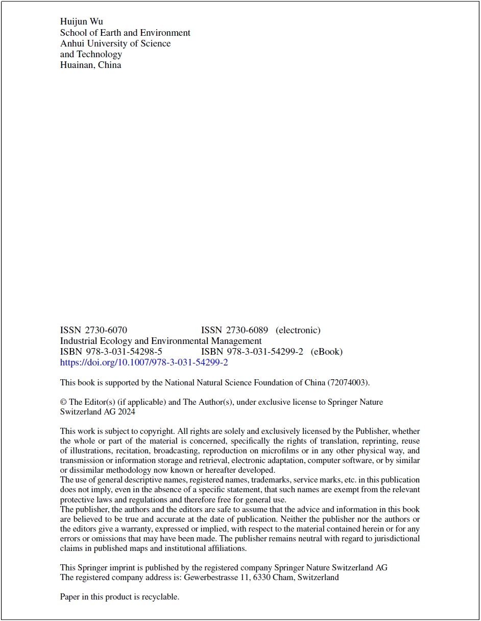 由武慧君教授独撰的著作《Material Flows with Nexus of Regional Socioeconomic System》(区域社会经济系统物质耦合代谢),于2024年5月在国际知名学术出版社Springer Nature(施普林格·自然集团)出版发行。该著作共九章,约60万字,系统性地阐述了区域社会经济系统中的物质代谢及其耦合关系造成的环境影响,是我校第一部由SpringerNature面向全球出版发行的专著,体现了国际著名学术出版机构对我校在区域可持续发展与物质代谢方面研究成果的高度认可。