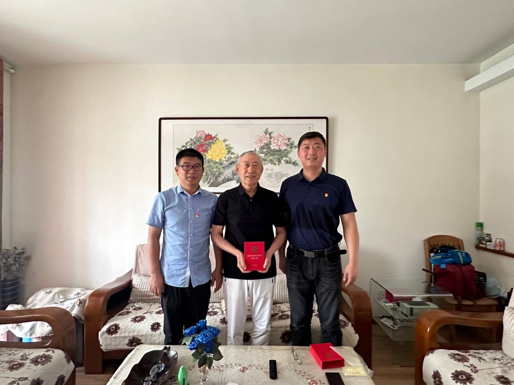 “七一”到来之际,为弘扬党的光荣传统和优良作风,表达对老党员的关爱和祝福,电子轮盘 党委书记陈楠一行走访慰问老党员周立功老师,代表学校颁发“光荣在党50年”纪念章。