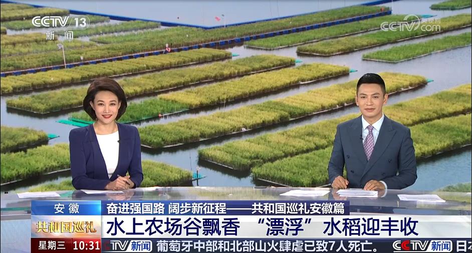 9月18日,中国中央电视台CCTV-13庆祝中华人民共和国成立75周年特别节目《奋进强国路 阔步新征程——共和国巡礼》以“水上农场谷飘香,‘漂浮’水稻迎丰收”专题报道了由安徽理工大学承担实施的“采煤地表沉陷区水面种植关键技术及模式研究与示范”项目成果。