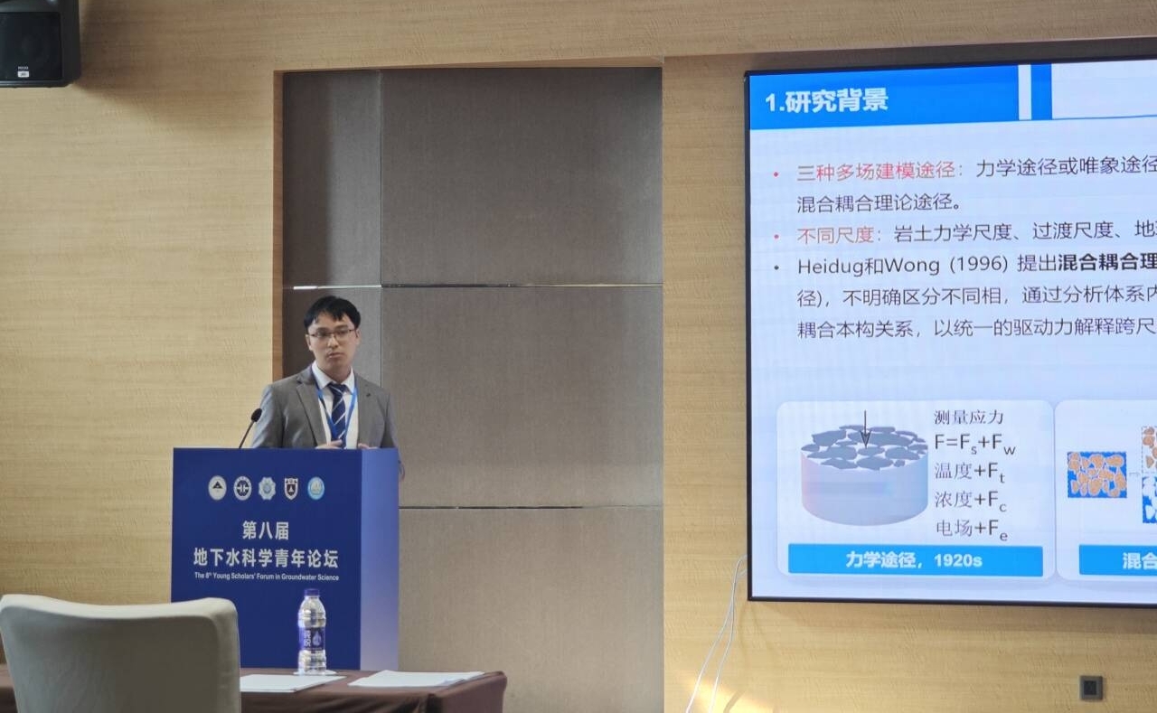 会议期间,电子轮盘 水科学与工程系教师王锴博士和戴鑫博士分别在不同分会场作题为“基于非平衡热力学的低渗页岩热-渗-力-化耦合建模研究”、以及“季风气候区土壤-地下水系统CO2垂向迁移过程研究”的学术报告。此外,电子轮盘 博士研究生汪启航作题为“单井注抽试验估算地下水流速的数值模拟与实验研究”的学术报告。上述报告在会场引起与会专家的广泛关注与热烈讨论。