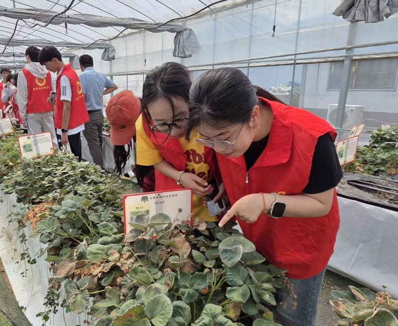 学生在观察草莓长势特点(摄影电子轮盘 团委提供)