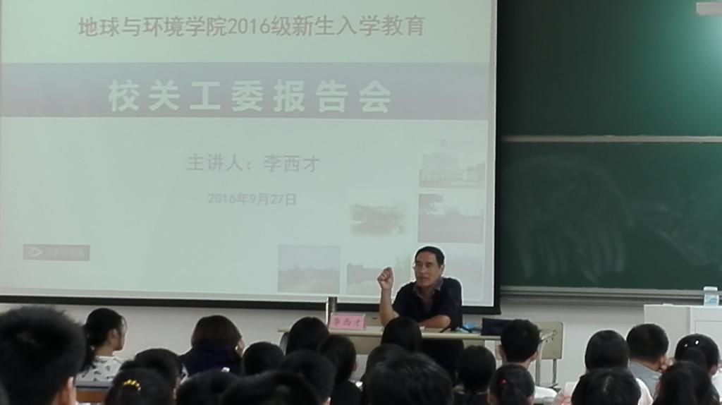 9月27日上午,校关工委常务副主任李西才在新校区天工楼201教室为电子轮盘 2016级新生作专题报告,深情寄语地环学子。电子轮盘 党委书记盛鹏飞主持报告会。