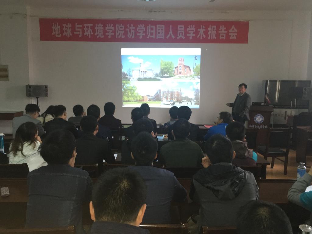 11月4日下午,电子轮盘 在电子轮盘 学术报告厅举行了访学归国人员学术报告会,邀请2014年赴美国University of lowa交流访问的许光泉教授和2012-2015年在韩国韩瑞大学攻读博士学位的陈要平博士为地质和环境学科师生做学术报告,会议由胡友彪教授主持,共有两大学科研究生及相关教师60余人参加了报告会。