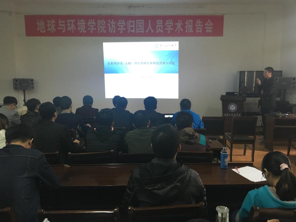 许光泉教授首先结合自身的美国访学之旅,介绍了The University of lowa的基本情况及其在专业方面的学习经历,随后作了题为《华北板块南缘“陷落体(柱)(KCC)”演化过程与研究方法探索》的报告。许教授结合中美地区不同的地质构造,分析了陷落体(柱)的成因、分布及影响因素——主要有多期的地质构造运动和地下水流作用以及碳酸盐岩的矿物组成成分等,阐述了华北板块陷落体(柱)的形成机制、演化过程、研究现状及个人研究成果。陈要平博士作了题为《低影响开发(LID)雨水管理技术研究进展与实践》的报告,围绕目前城市化过程中不断增加的径流污染和洪涝灾害问题,结合自己的相关研究,详细阐述了基于低影响开发的城市雨水收集及排放系统的原理及运行机制,介绍了该领域研究的最新进展及存在问题。